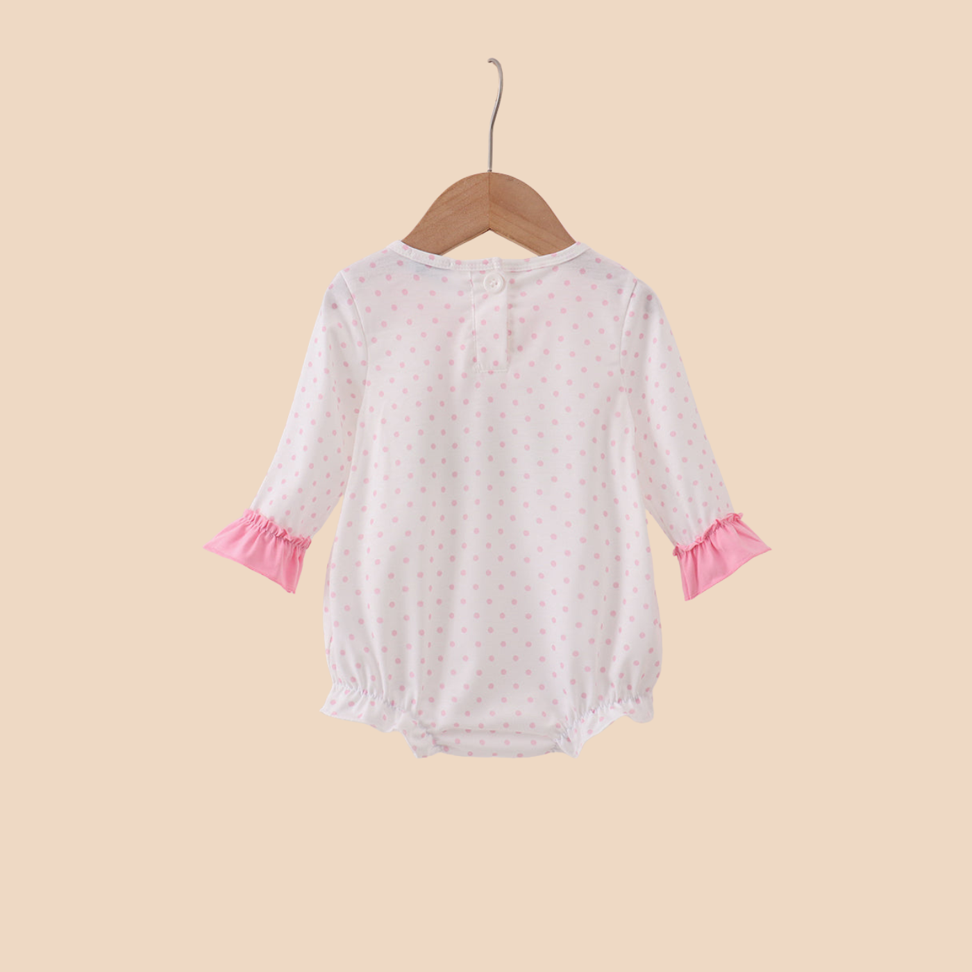 Add festive charm with this pink bubble romper featuring embroidered Christmas trees and sweet ruffle details. Soft, comfy, and perfect for holiday celebrations or family photos.